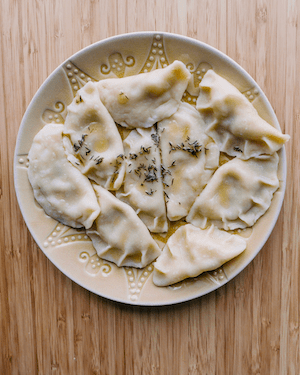 The sweetness of ripe pears pairs beautifully with the salty, creamy bite of Gorgonzola. Wrapped in soft dough and served with melted butter with a hint of thyme, these pierogi taste like autumn comfort and dinner-party luxury rolled into one.