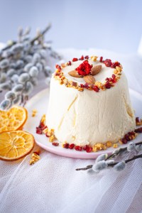 - The next day, take it out carefully, unwrap it, and decorate it however you like. Slivered almonds, dried fruit. Keep it in the fridge and enjoy your creamy, no-bake Polish pascha!