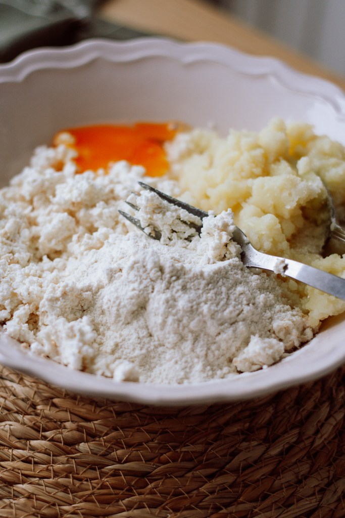 - Make the Dough. In a medium bowl, crumble the smoked twaróg with a fork or potato masher. Mix in the egg, potatoes and salt until smooth. No big lumps! Then add flour 1 Tbsp at a time. Gently combine into a soft, slightly sticky dough.